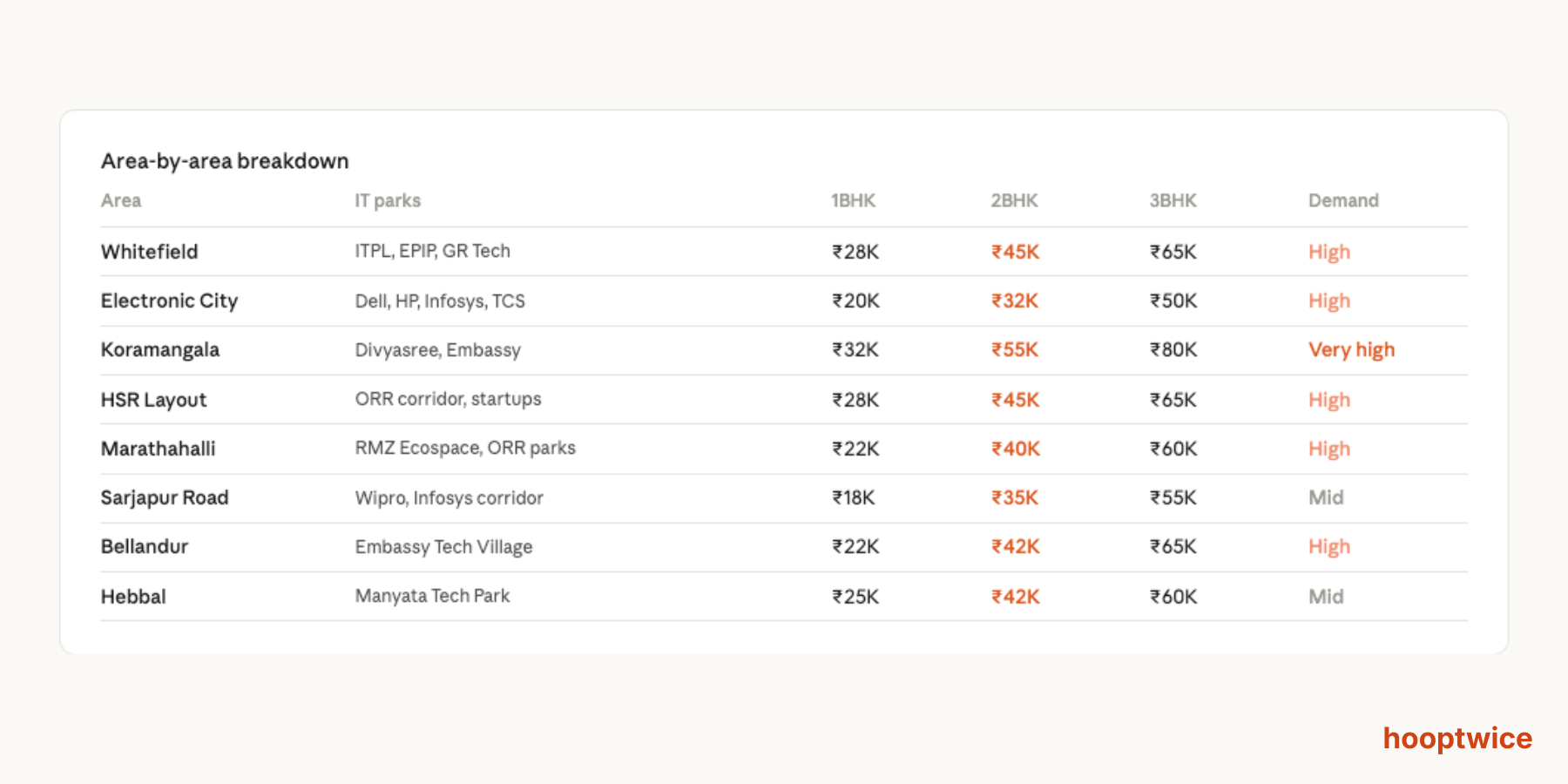 HSR Layout ORR corridor, startups ₹28K ₹45K ₹65K High