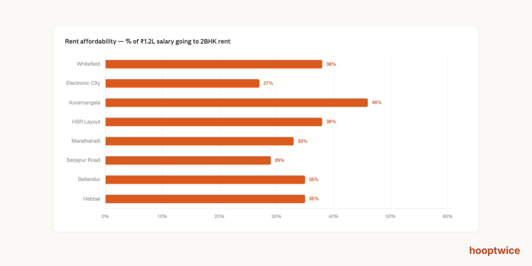 Whitefield and HSR Layout land at 38%, which is high but manageable for most people who are otherwise not carrying significant EMIs or loans. The practical ceiling most Bangalore professionals settle on is 35 to 40%, not 30%. The 30% rule was not written with Bangalore's rental market in mind.